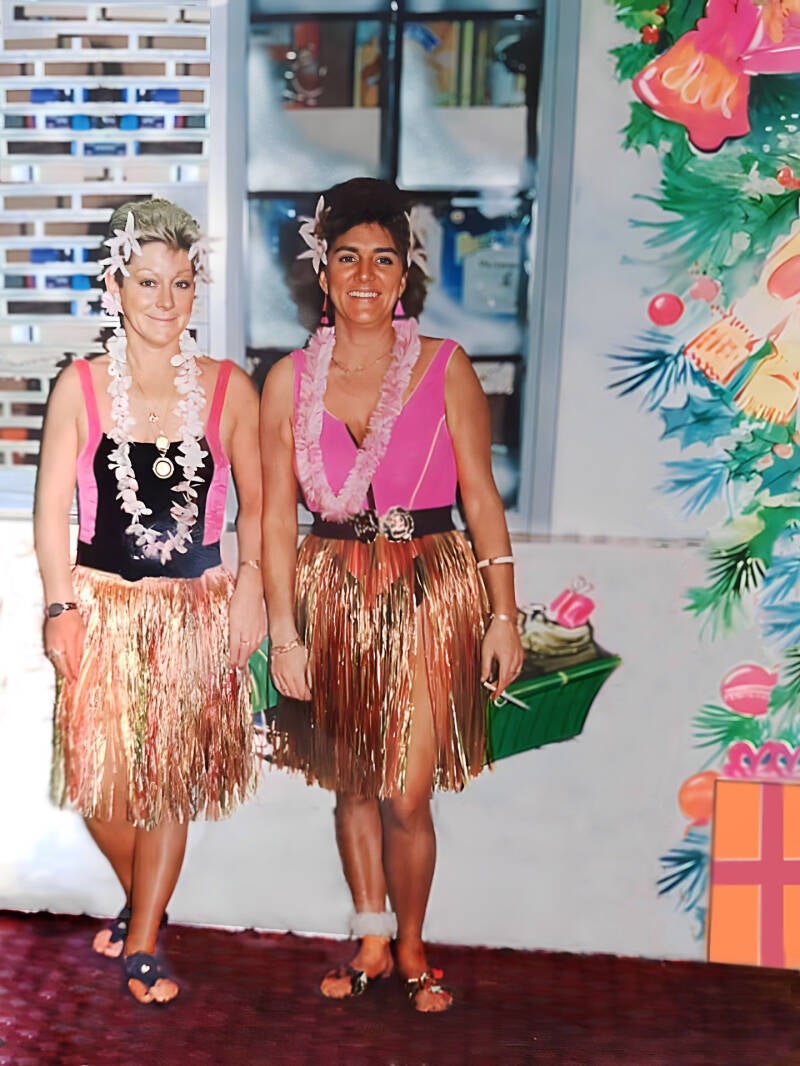Embracing the festive season with a tropical flair, Beryl Shaw & Yvonne Oates dressed for a Hawaiian-Christmas event,  posed in front of the Prize Bingo Shop.
