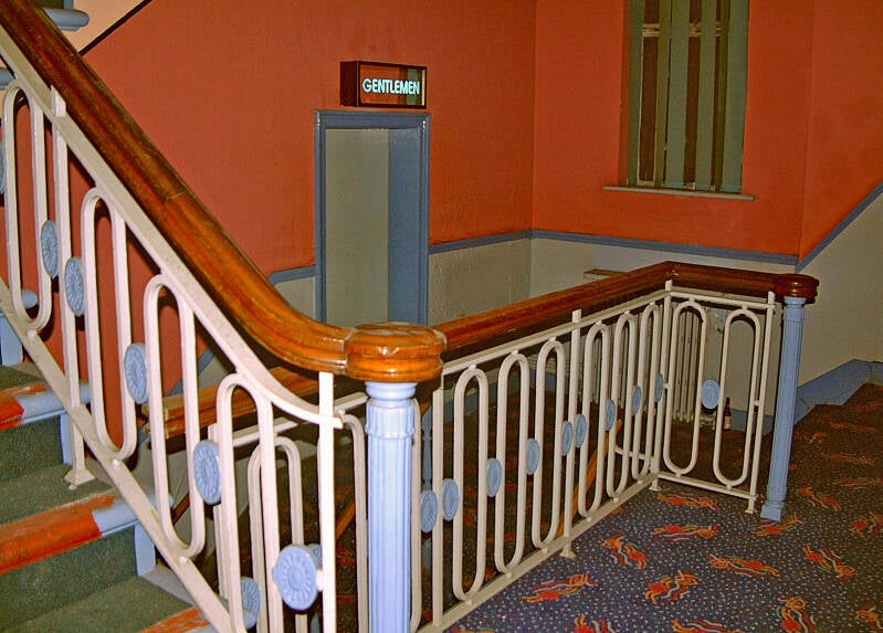 The elegant marble steps hidden below Mecca Bingo carpeting, with cast iron balustrades topped with mahogany handrail.