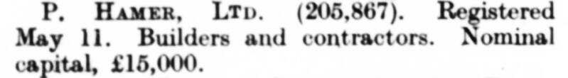 The Builder. (1925, June 12). Company registration: P. Hamer Ltd., Swinton. [Trade journal clipping]. Private collection.