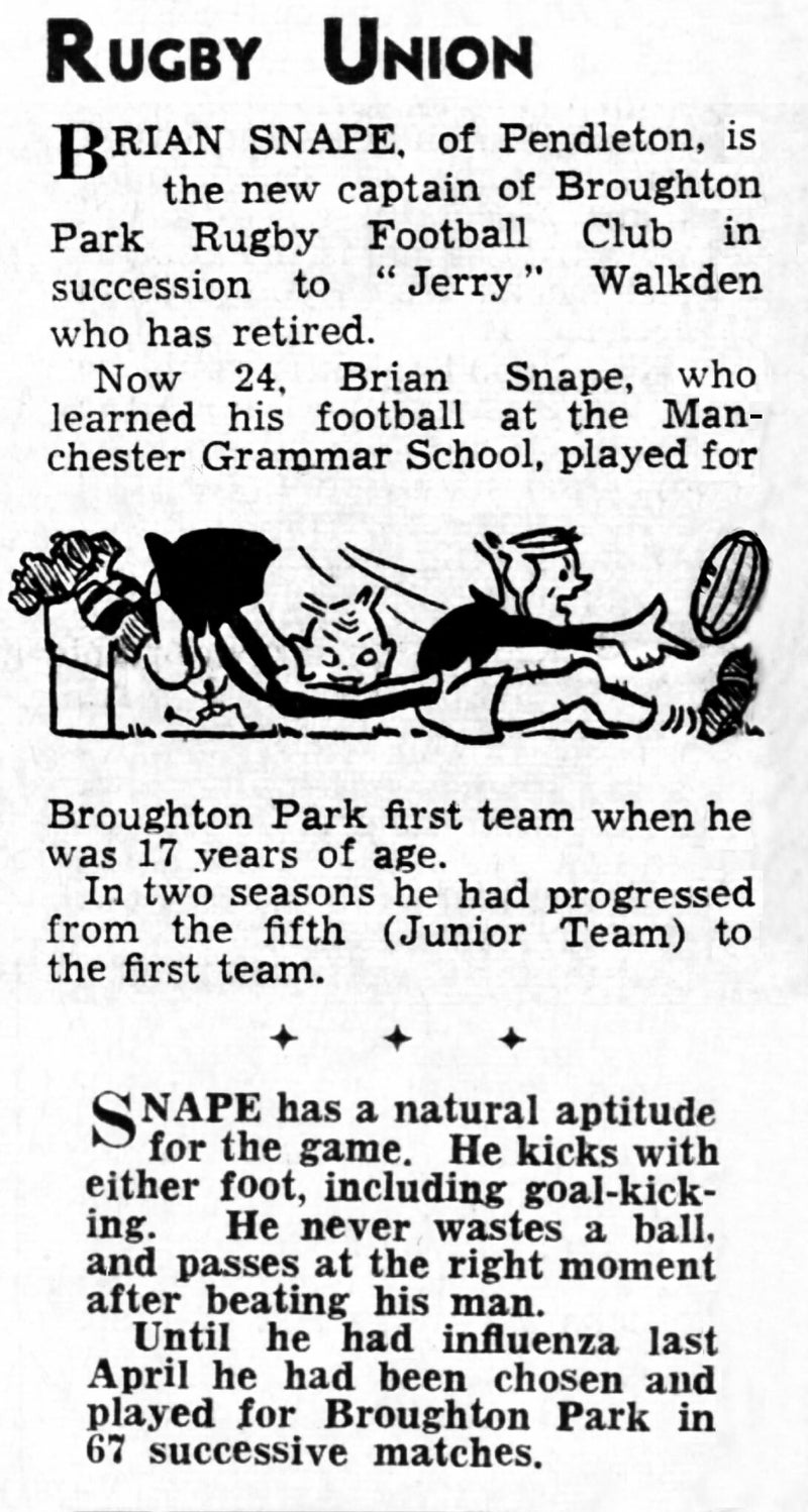 Outside of work, Brian was a passionate and skilled rugby player. In 1933, he played as a fly-half for Broughton Park Rugby Club and, just a year later, was made team captain, an early sign of his leadership qualities and deep love for the game. His rugby talent would continue to play a significant role throughout his life.
